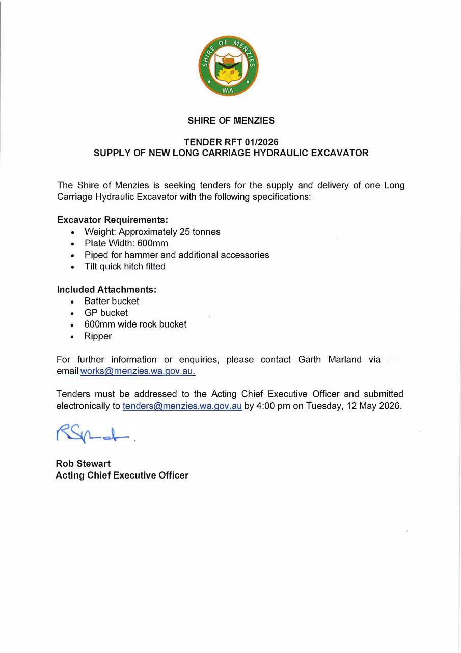 RFT 01/2026 Supply and Delivery of New Long Carriage Hydraulic Excavator